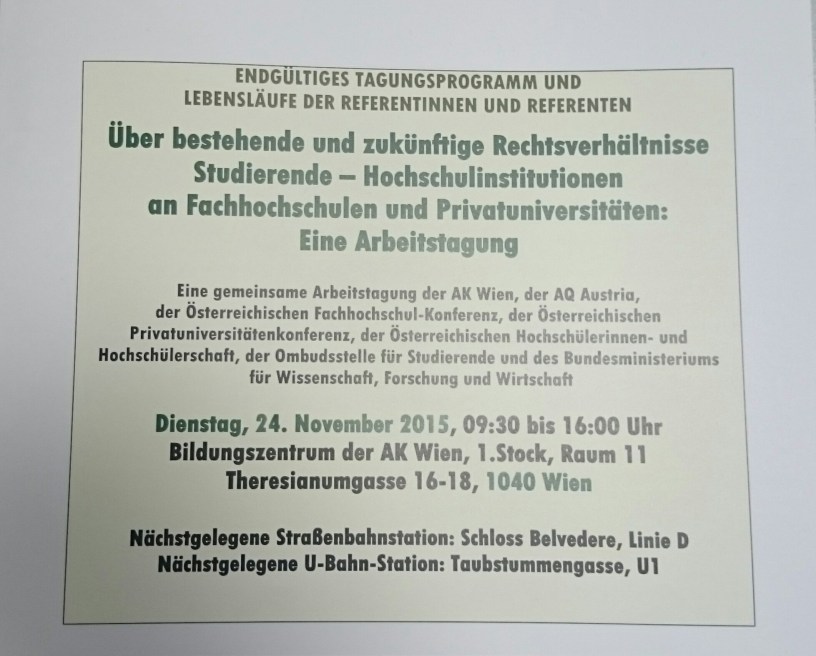 Im Rahmen der Arbeitstagung des Hochschulombudsmanns „Über bestehende und zukünftige Rechtsverhältnisse Studierende – Hochschulinstitutionen an Fachhochschulen und Privatuniversitäten“ im Bildungszentrum der Arbeiterkammer Wien am 24.11.2015 habe ich einen Vortrag zum Thema „Vertragswesen im Universitätsalltag: Erfahrungen an der Anton Bruckner Privatuniversität“ gehalten.